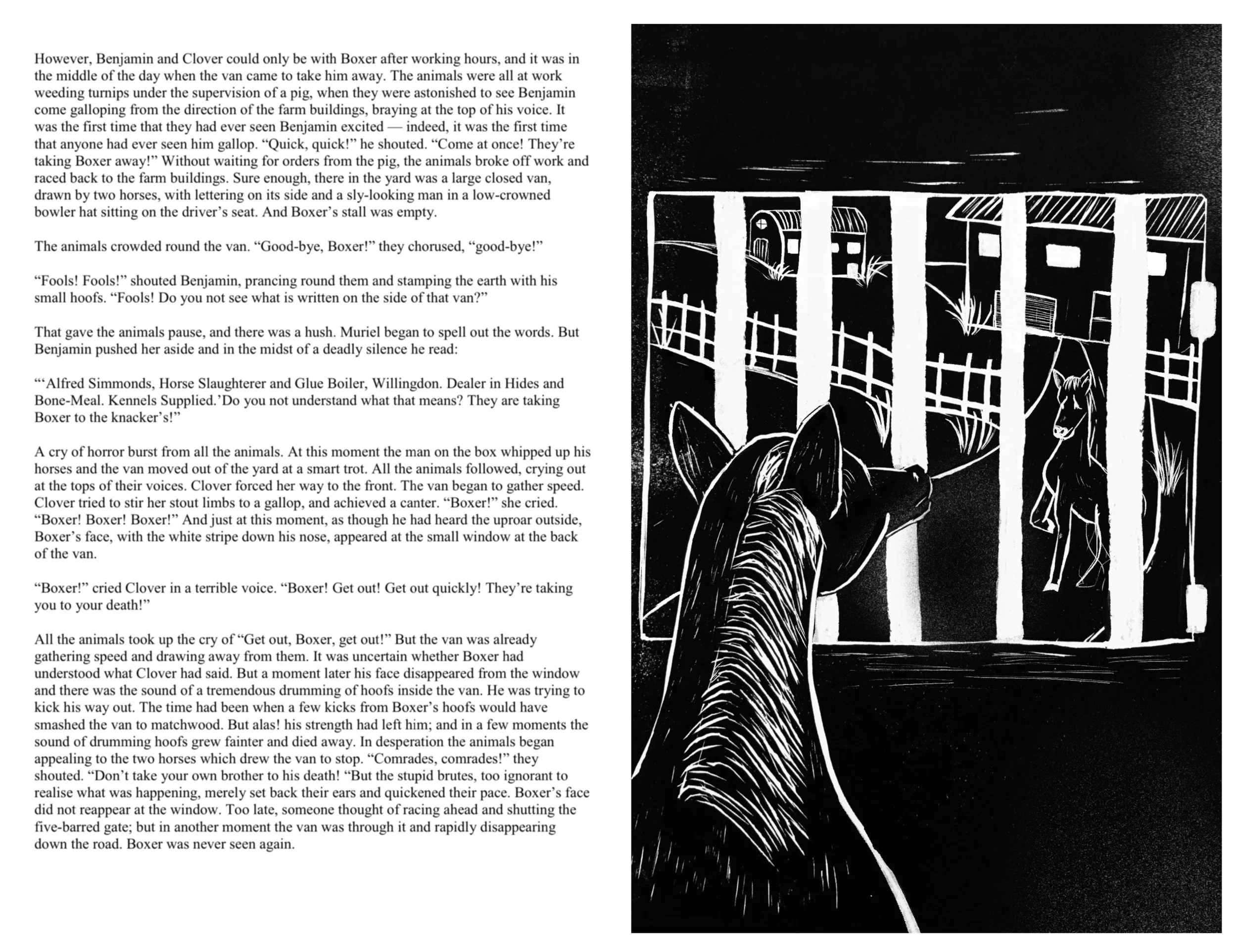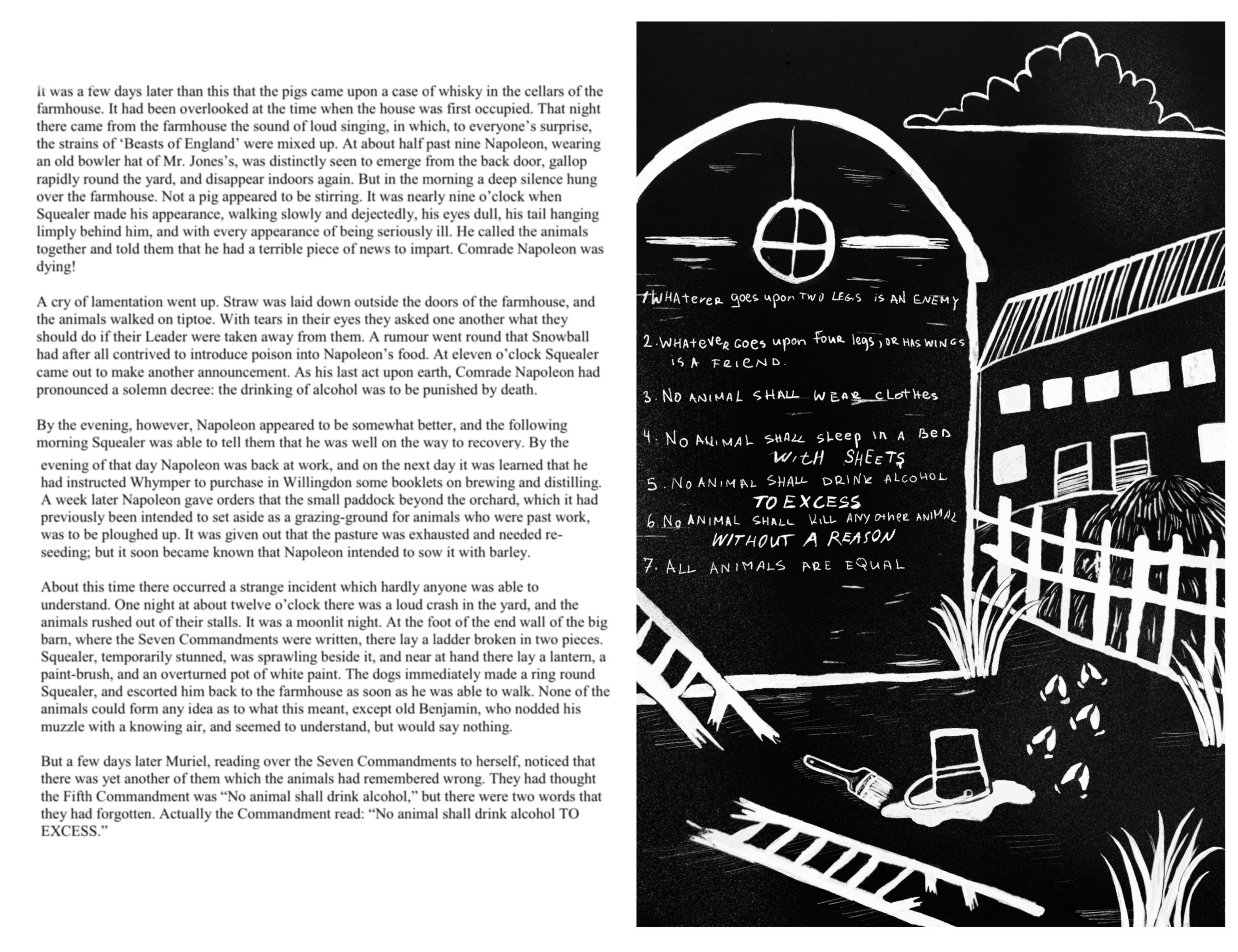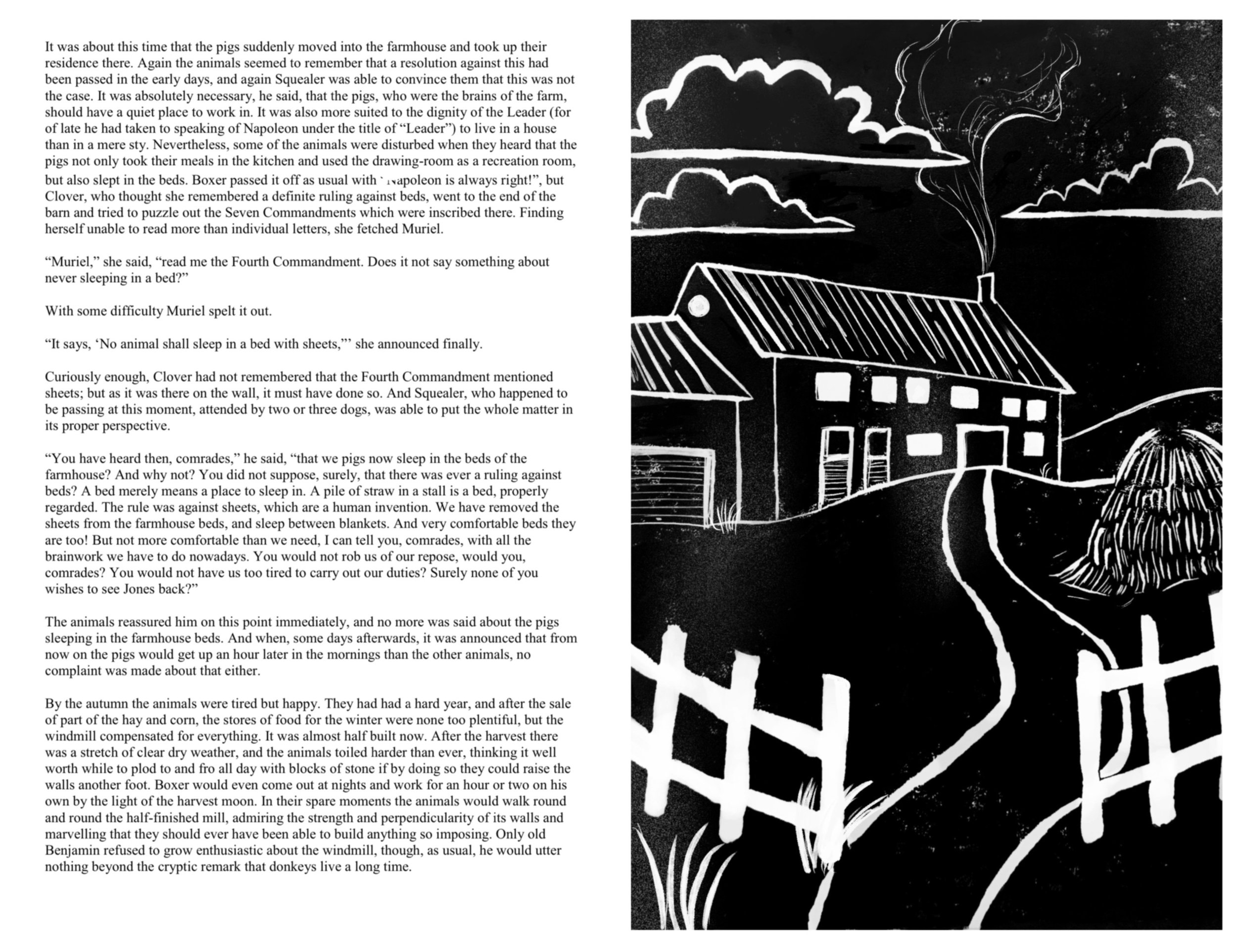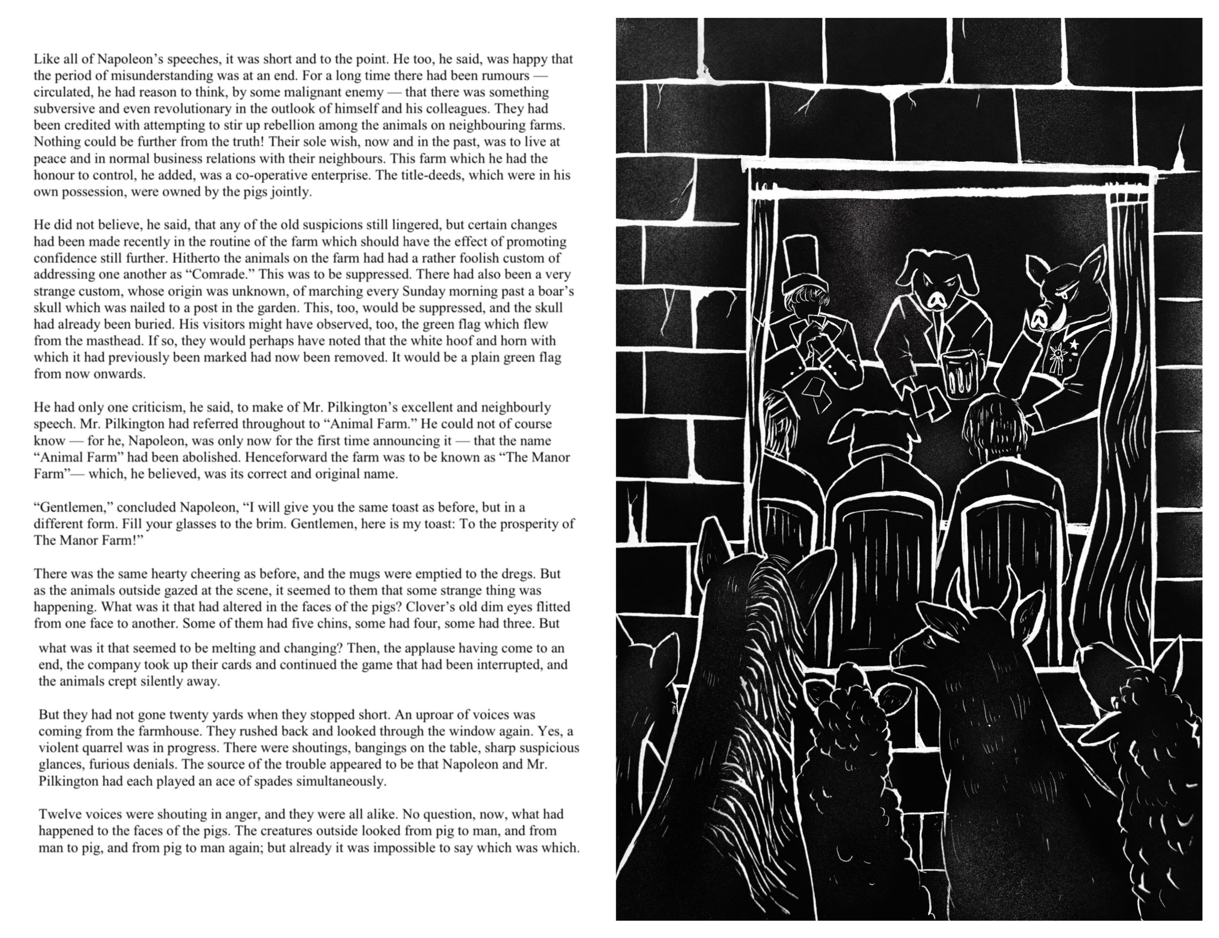 Designed a book cover for the George Orwell’s book “Animal Farm” as an entry for the Penguin Book cover design awards. The project is taken upon including four more internal illustrations. The cover is done digitally and formatted on InDesign and the internal images are relief printed, scanned and rendered on Photoshop.