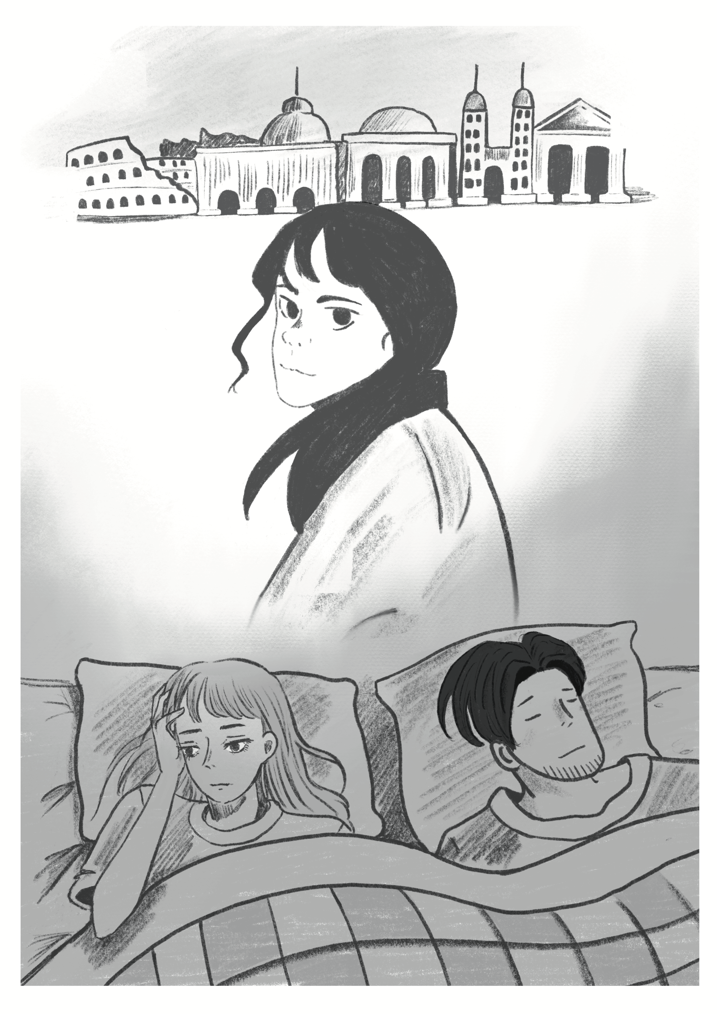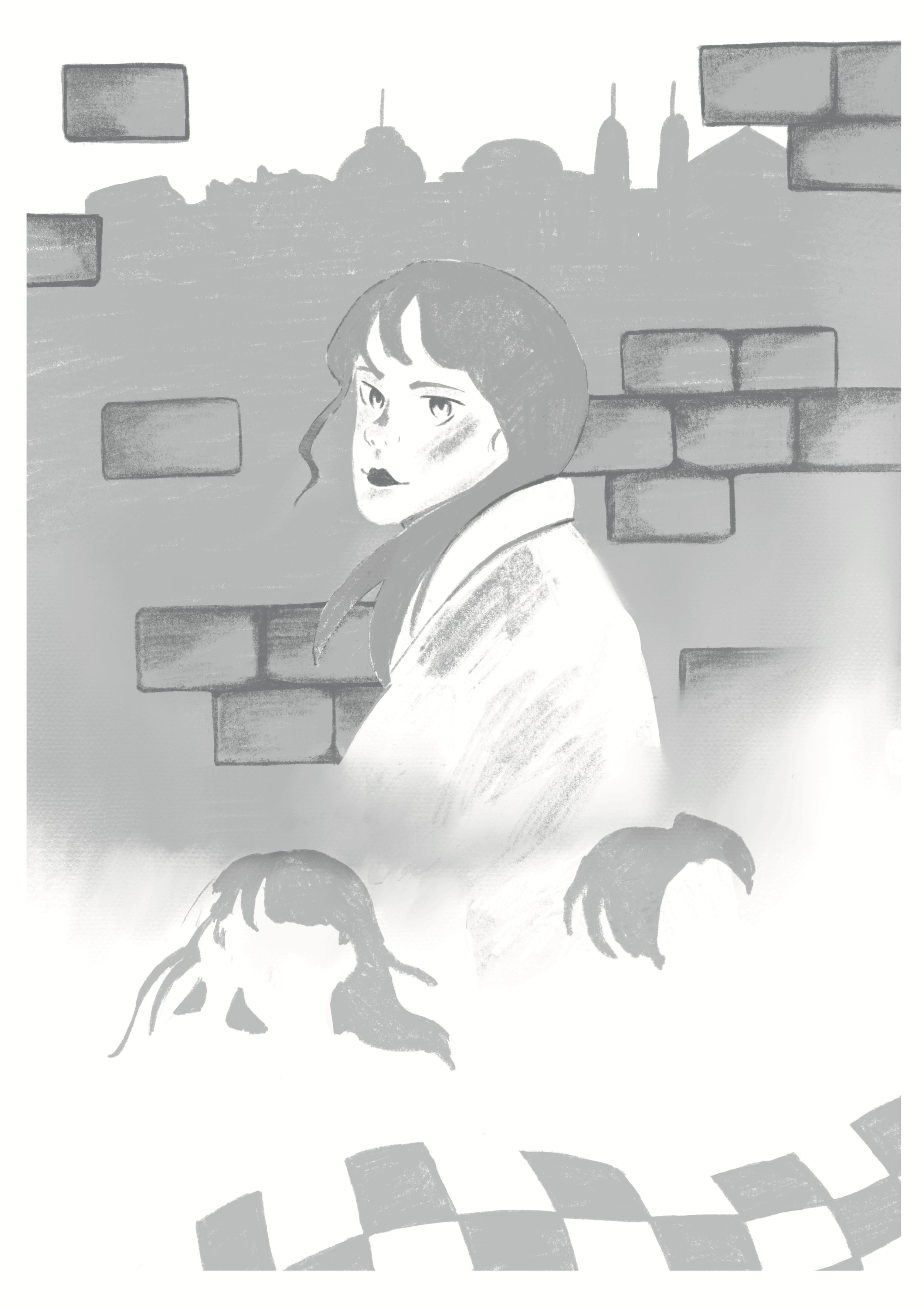 Riso prints of the first page of my wordless narrative book based on Deborah Levy’s story “Roma”