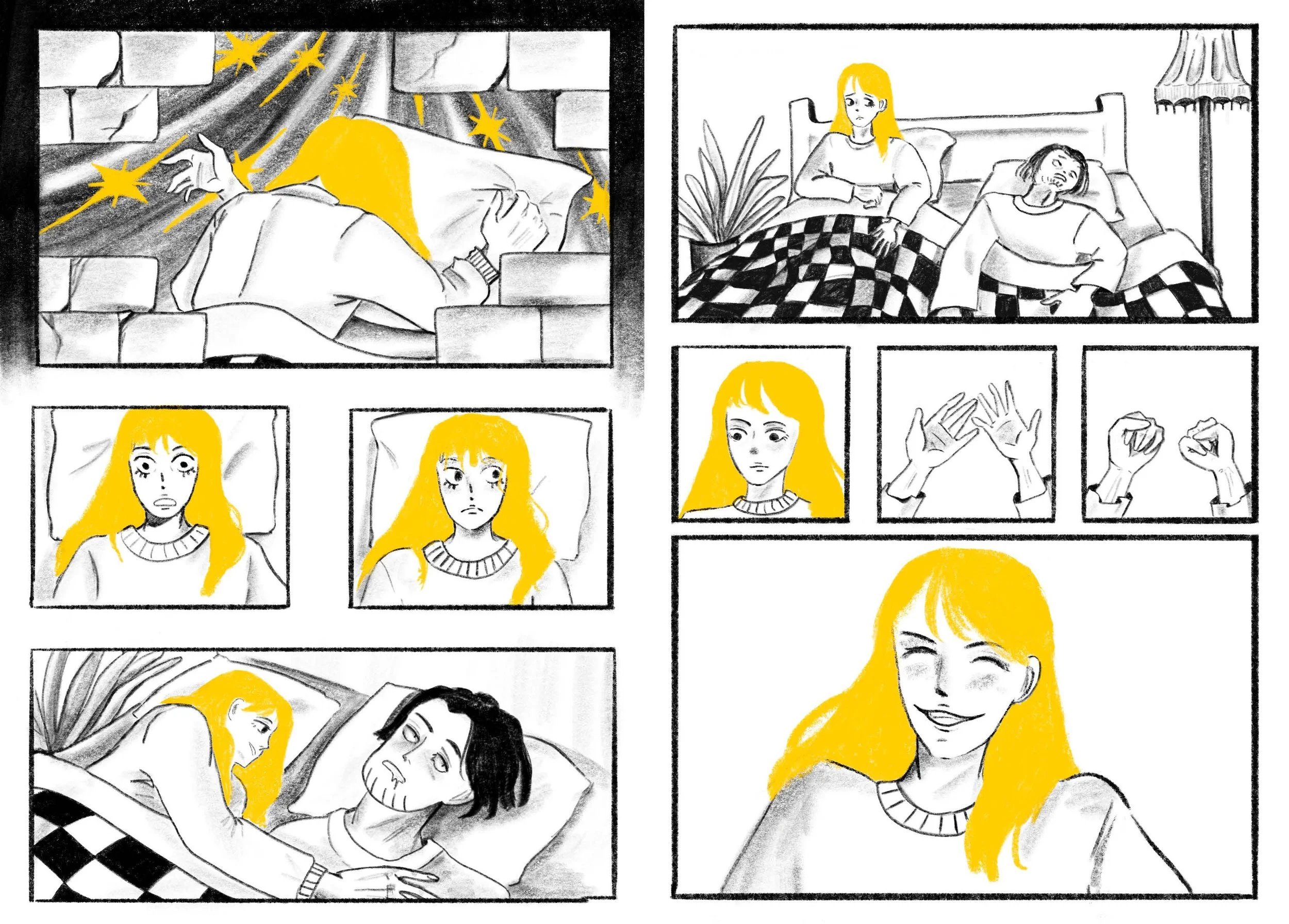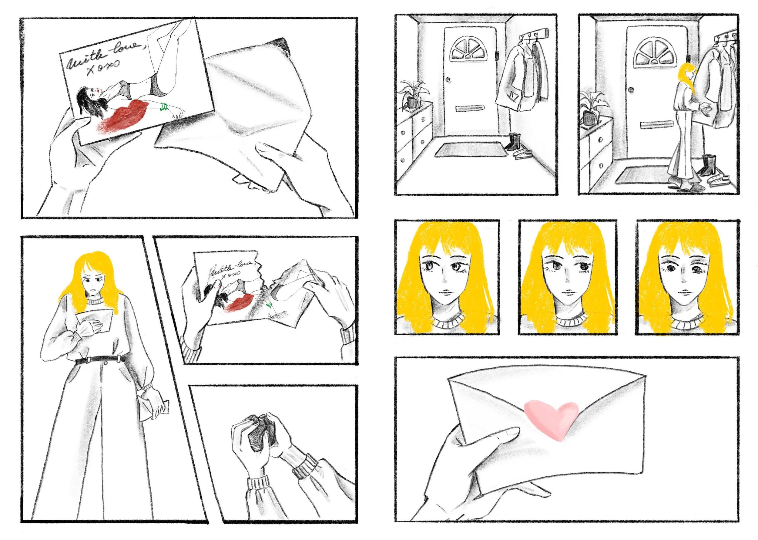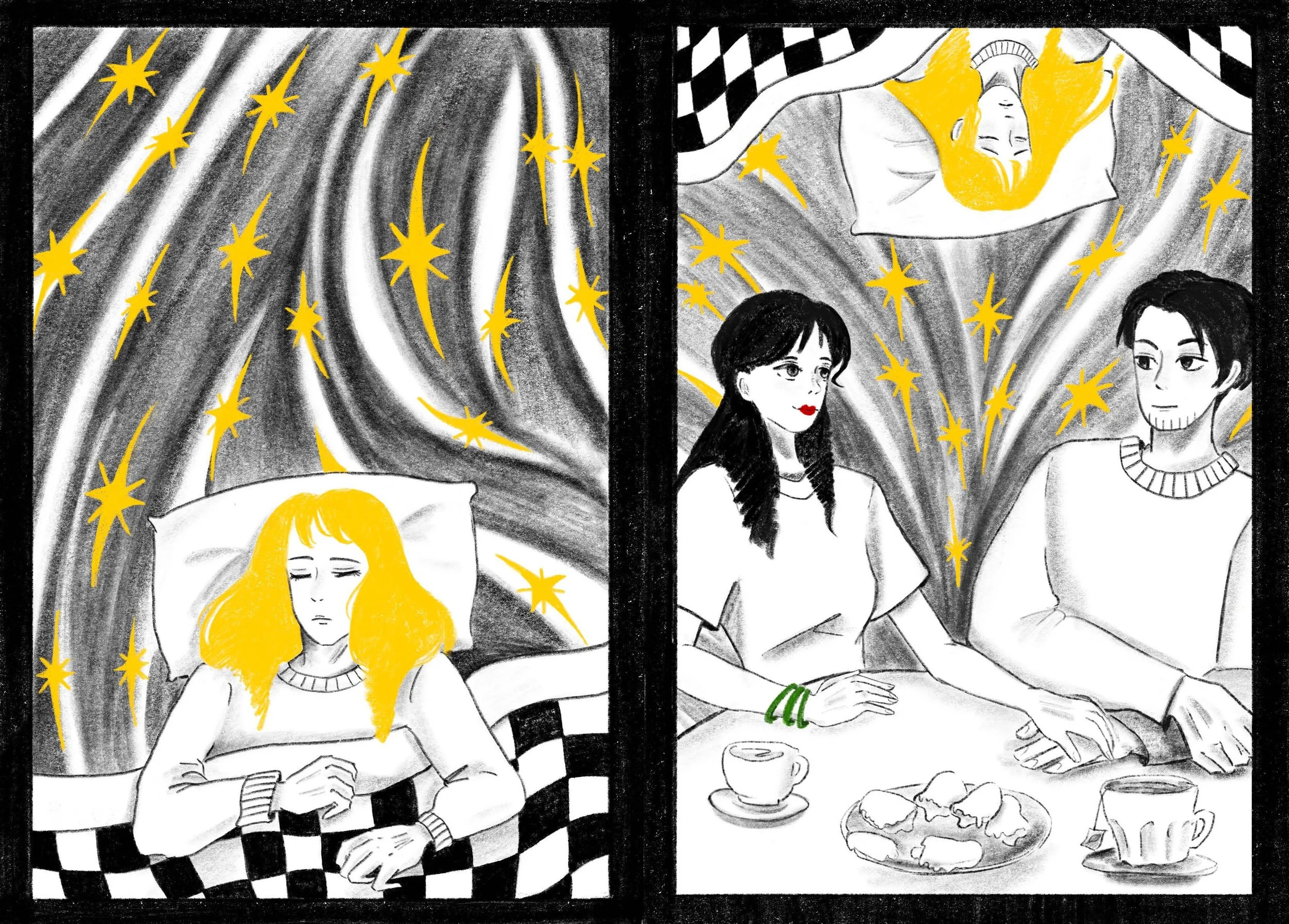 This project is based on a story by D. Levy. A story focused on romance, affairs and the delusion between reality and dreams. I have illustrated the images digitally using a limited colour pallet and pencil marks. Later on I have printed and book-binded physical copies.
